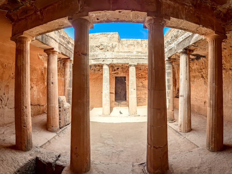 Da qui, ci dirigeremo a Paphos, una città di origine fenicia abitata fin dai tempi neolitici e considerata il luogo di nascita di Afrodite. La regione, insieme a Palaepaphos, è stata dichiarata Patrimonio dell’Umanità dall’UNESCO nel 1980 grazie alla ricchezza storica e architettonica dei suoi resti archeologici. Paphos fu un importante centro di culto di Afrodite e di altre divinità della fertilità. Visiteremo le Tombe dei Re, un insieme monumentale di tombe scavate nella roccia con colonne, risalenti al IV secolo a.C., utilizzate per seppellire alti funzionari durante il periodo Tolemaico.