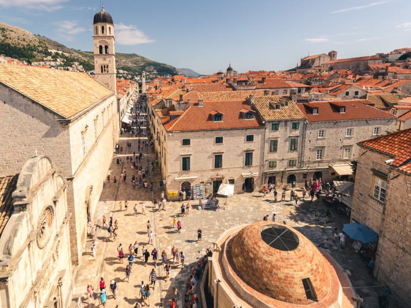 Proseguiremo con la nostra guida verso l'iconica Porta Pile, uno degli ingressi principali alla città antica. Da qui, ci addentreremo nello Stradun, la strada più famosa di Dubrovnik. Questa vivace via pedonale, lunga circa 300 metri, divide in due il centro storico e ospita i principali monumenti, negozi, caffè e ristoranti. Su Stradun, locali e turisti si mescolano, creando un'atmosfera vibrante e piena di vita. Curiosamente, questa strada non esisteva nel Medioevo; in origine era un canale paludoso che fu prosciugato nel XIII secolo, diventando il cuore pulsante della città.