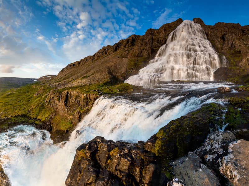 Il punto culminante della nostra escursione di oggi è la maestosa bellezza della cascata di Dynjandi, una delle più belle dell'Islanda e un'icona dei fiordi occidentali.