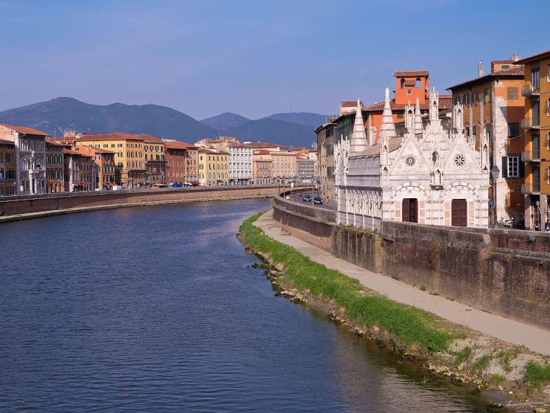 Costeggiando il fiume Arno, troviamo la Chiesa di Santa Maria della Spina, il Palazzo Agostini Venerosi della Seta, il Palazzo Blu e la Chiesa di Santa Cristina, costruita nel XVI secolo. Continueremo poi la nostra passeggiata attraverso Piazza Garibaldi fino a raggiungere il Teatro dei Lungarni. Da lì, cammineremo per le strette vie del Borgo Stretto, fino a raggiungere Piazza San Felice da dove potremo ammirare i capitelli che rappresentano immagini delle battaglie dell'era ellenistica. Proseguiremo poi verso Piazza dei Cavalieri di Santo Stefano con la sua Chiesa e la Torre Gualandi dove il famoso Conte Ugolino, uno dei protagonisti della Divina Commedia di Dante, morì di fame.