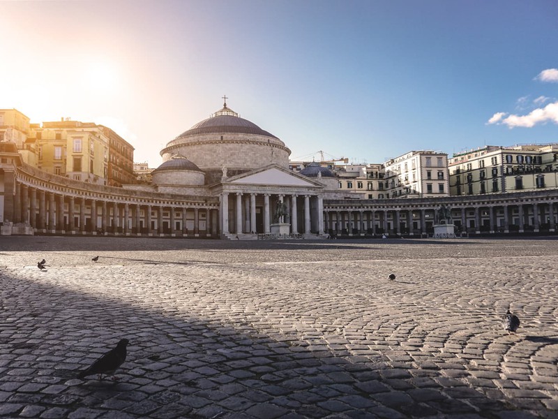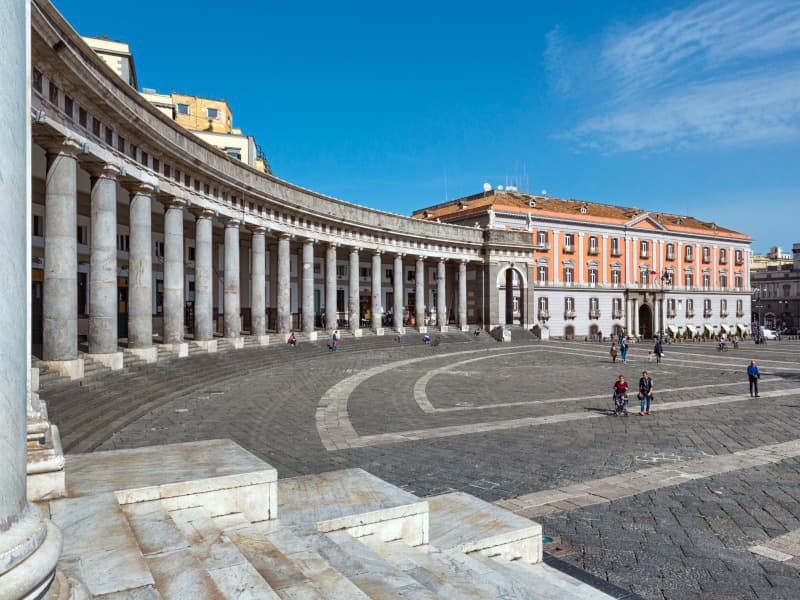 La nostra passeggiata ci conduce nel cuore della città, verso l'imponente e maestosa Piazza del Plebiscito, dove potremo ammirare: il Palazzo Reale, una delle quattro residenze utilizzate dalla casa reale dei Borboni di Napoli; la Basilica di San Francesco da Paola, esempio più importante del periodo neoclassico in Italia; Palazzo Salerno, costruito alla fine del XVIII secolo, e il Palazzo della Prefettura di Napoli. Qui, in Piazza del Plebiscito, si trova anche il famoso e storico Caffè Gambrinus.