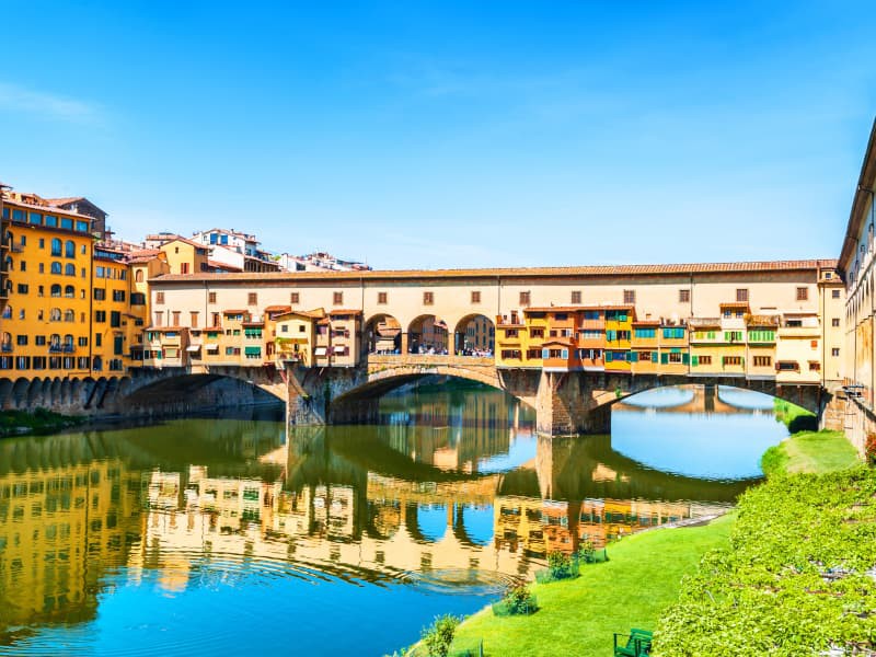 Continueremo la nostra passeggiata per le strade, da Piazza della Repubblica a Piazza della Signoria, passando per Palazzo Vecchio, il centro politico, con il suo cortile fiorito e i suoi tesori artistici. La Loggia dei Lanzi è un museo all'aperto con capolavori di scultura. Passando per il Ponte Vecchio, l'unico ponte di Firenze non distrutto durante la Seconda Guerra Mondiale, si arriva in Piazza Santa Croce per ammirare la magnifica chiesa di Santa Croce (esterno), luogo di sepoltura di Michelangelo.