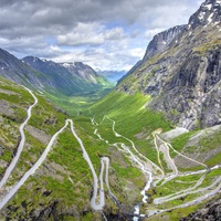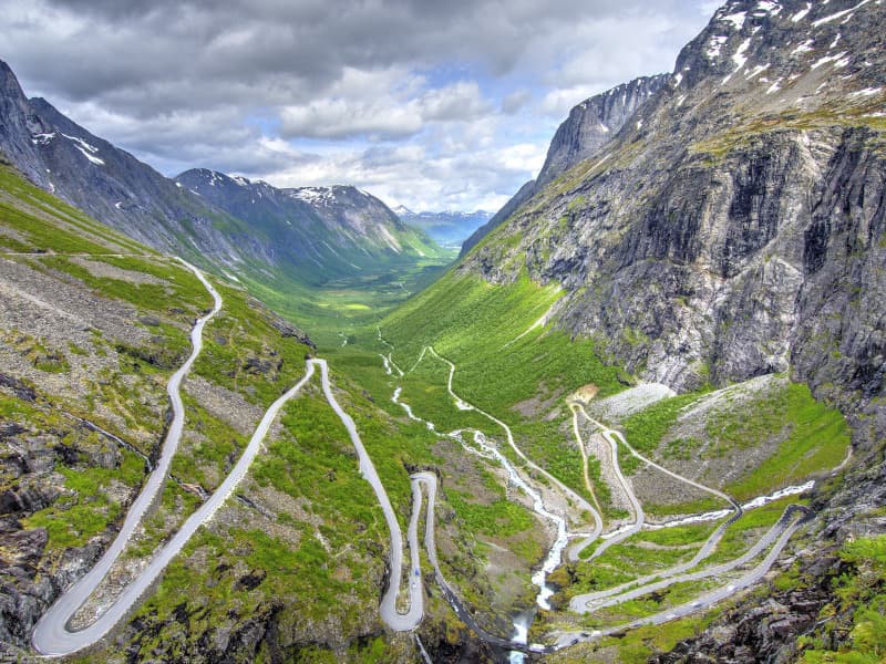 Saliremo lungo la iconica strada Trollstig (Sentiero dei Troll), un capolavoro di ingegneria che si snoda attraverso 11 spettacolari tornanti fino alla cima. Faremo una sosta per contemplare la maestosa cascata Stigfoss, con i suoi 180 metri di altezza, un luogo perfetto per scattare foto ricordo.